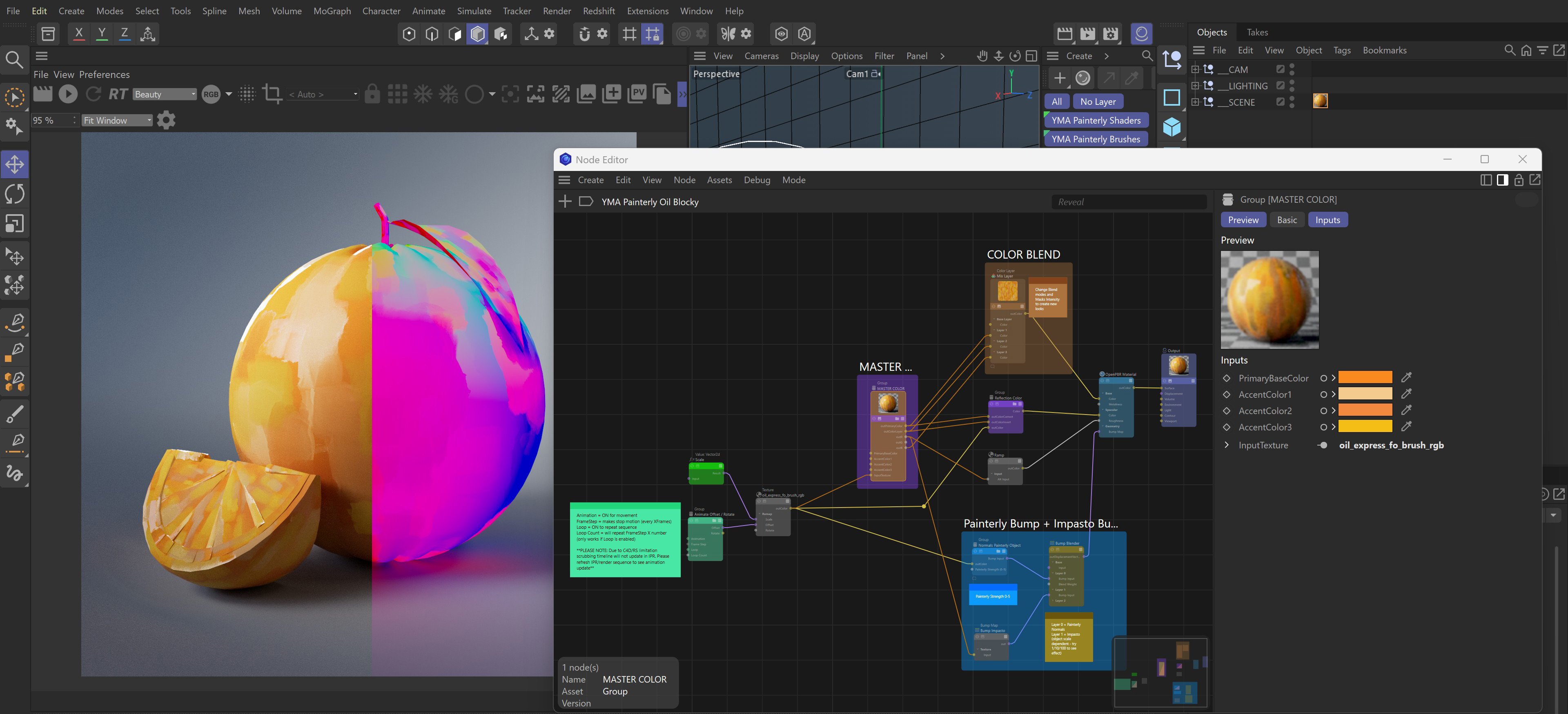 YMA Painterly is setup with color coded nodes, exposed parameters and easy to modify base + accent colors. Also included are settings for: painterly normals, scale, procedural stop motion animation, impasto (oil shaders only), and more, allowing complete control of your masterpieces!
