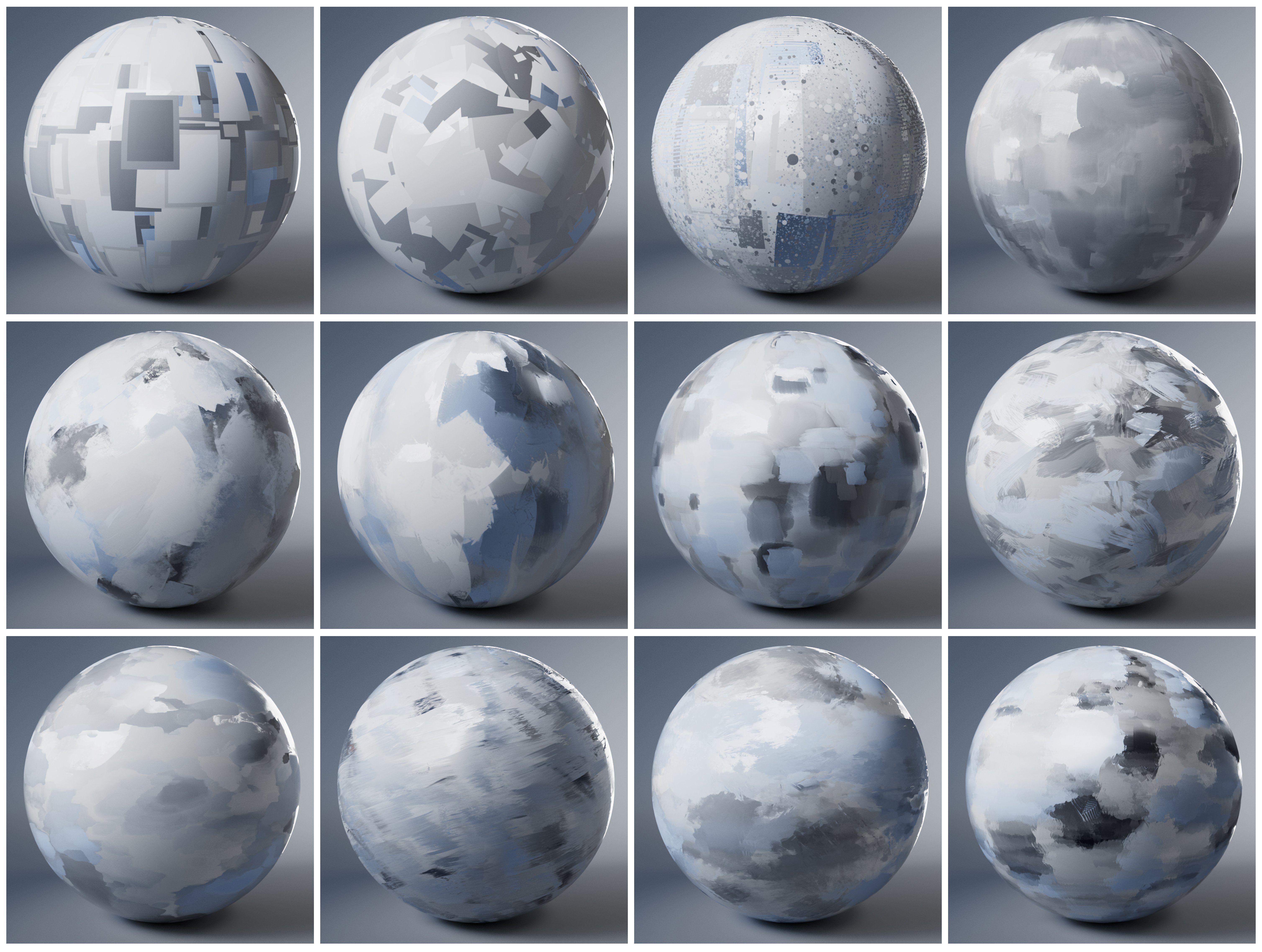 - 12 Custom handcrafted 4k/2k tileable textures. Created using real brushstrokes and paint effects to mimic real world and stylized paint techniques.